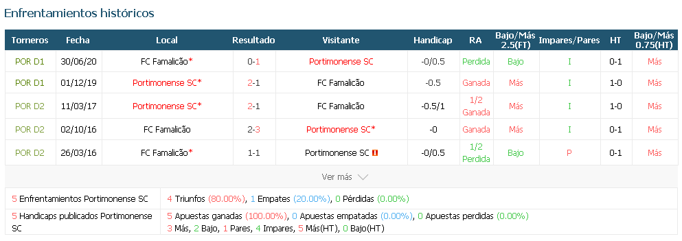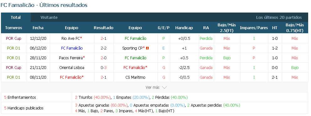 de los últimos cinco partidos de Famalicao fuera de casa hubo más de 2,5 goles.
