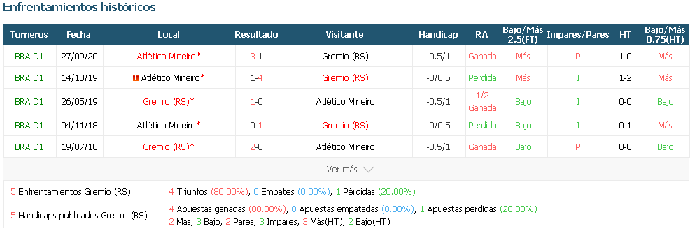 últimas 3 recepciones al Atlético Mineiro, el Gremio ganó.