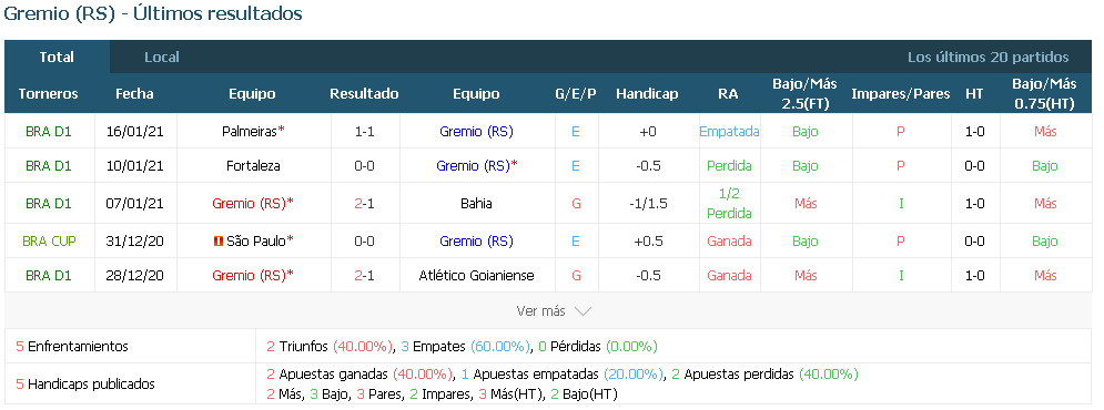 Gremio ha ganado 10 de los últimos 11 duelos en casa.