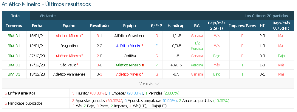 50 puntos y está en una serie de 7 juegos sin perder. El Atlético Mineiro, por