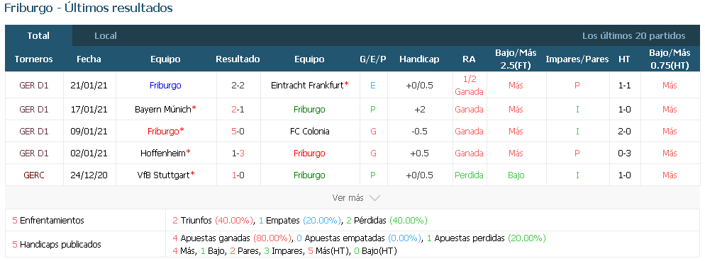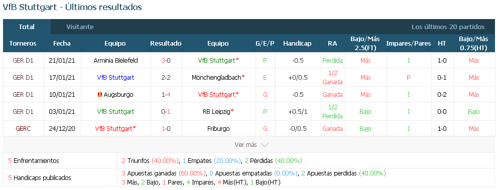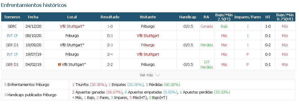 El Stuttgart sufrió todo tipo de problemas en la retaguardia en la derrota de mediados de semana, y dado el potencial ofensivo del Friburgo cuando juega en el Schwarzwald-Stadion, debería plantearse la victoria en casa. Hofler regresa de su suspensión para los anfitriones, mientras que Abrashi, Flekken, Kwon Chang-Hoon, Santamaría y Schmid siguen en la sala de recuperación. González y Wamangituka regresan de la suspensión para los visitantes, mientras que Mola, Egloff, Awoudja y Al Ghaddioui son bajas por lesión.