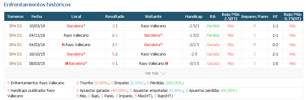 enfrentamiento en partido oficial, el Barcelona derrotó al Rayo Vallecano por