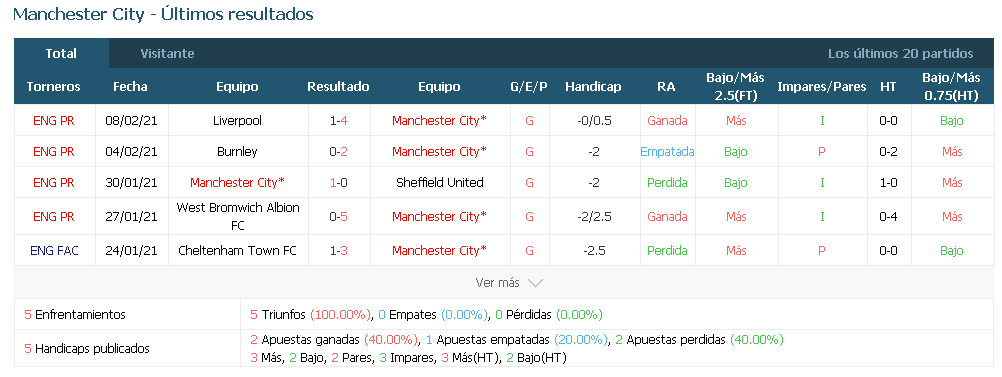partidos ha marcado más de 2,5 goles. Fuera de casa, el City suma ocho