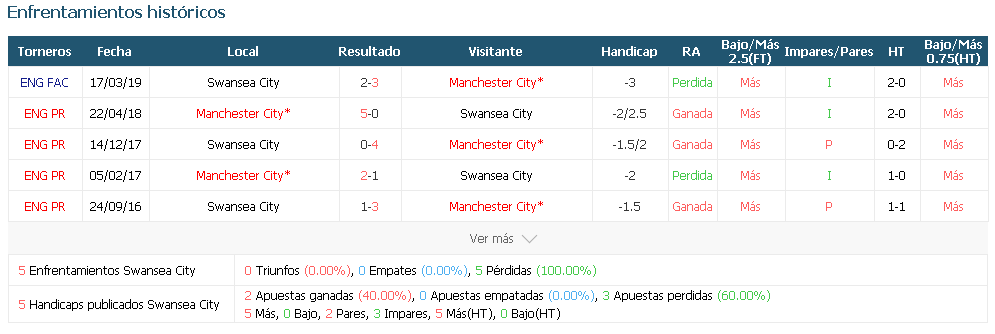 Swansea no ha ganado ningún partido contra el Manchester City en 13 ocasiones.