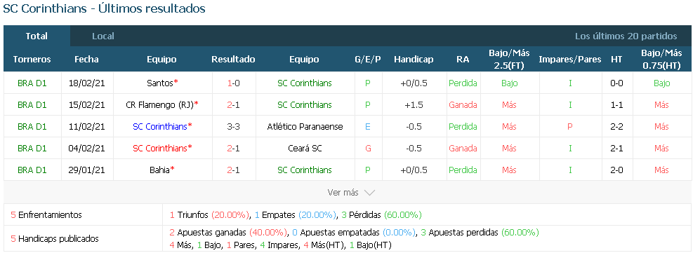 Corinthians ha marcado goles en sus últimos 6 partidos.