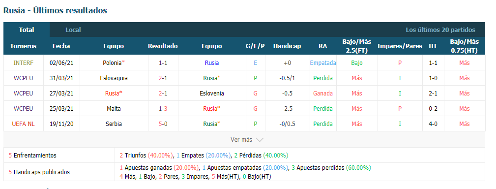 Después de compartir el botín con una Polonia sin Lewandowski, Rusia intentará volver a la senda de la victoria cuando se enfrente a Bulgaria en otro partido de preparación. Las tropas de Stanislav Cherchesov están ansiosas por impresionar en su último amistoso antes de la fase final de la Eurocopa 2020, y estamos seguros de que el experimentado estratega va a alinear el mejor equipo posible en esta ocasión. Tanto Fernandes como Cheryshev aspiran a la titularidad, mientras que el atacante del Zenit Dzyuba debería seguir liderando la línea de los anfitriones.