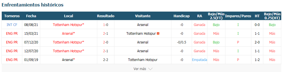 Derby Londrino en la sexta jornada del campeonato de fútbol inglés, con el Arsenal recibiendo al Tottenham. El partido será el domingo 26 de septiembre de 2021, a las 16:30 horas, a la espera de un duelo muy emotivo, como es habitual cuando estos dos equipos se enfrentan, con una gran rivalidad. Los Gunners empezaron muy mal la temporada, con 3 derrotas consecutivas en la Premier League, pero se recuperaron en las últimas semanas, sumando 2 victorias en los 2 últimos partidos. Aún así, el Arsenal todavía tiene un mal historial de solo 2 goles marcados en 5 partidos. El Tottenham de Nuno Espírito Santo arrancó con tres victorias consecutivas 1-0, pero perdió en los dos últimos partidos por un expresivo 3-0, ante Crystal Palace y Chelsea.