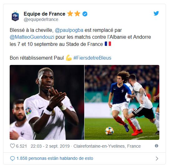 La Federación Francesa de Fútbol anunció que Paul Pogba, debido a lesión, es baja para los partidos de clasificación para la Euro 2020 de la selección campeona del mundo ante Albania, el día 7, y Andorra, el día 10.