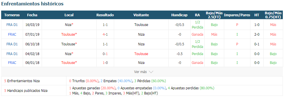 El Toulouse ha perdido 8 partidos seguidos en la liga. Sin embargo, han visto muchos goles fuera de casa y han logrado marcar en la mayoría de los partidos. Pero no será fácil en Niza, que tiene fama de ser un equipo fuerte en casa. El Niza confiará en el apoyo de los aficionados para este partido, pero también en su buen estado de forma en casa esta temporada. Sólo han perdido dos partidos en la Allianz Riviera. Esperamos que la tendencia continúe: un partido con un alto puntaje, con el Toulouse registrando otra derrota.